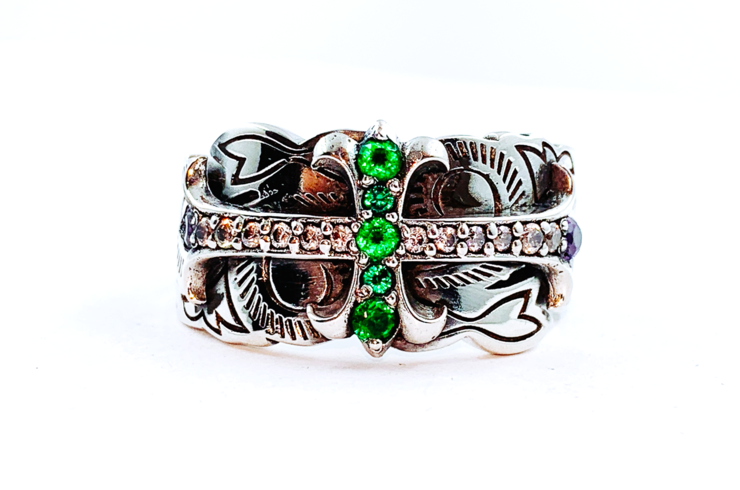 2024/04/22こんにちは!! 名古屋大須シルバーアクセサリー&レザーショップLEGALISSの松本です!! 今回はカスタムリングについてご紹介します! Legalss Original 〜カスタムノーブルクロスリング〜 今回のお客様は当店で扱っているオリジナルリリングに興味を持って頂き人差し指用のリングとしてカスタムさせて頂きました! クロスのセンター部分の5石をエメラルドグリーンCZに変更し、クロスの両端の... -